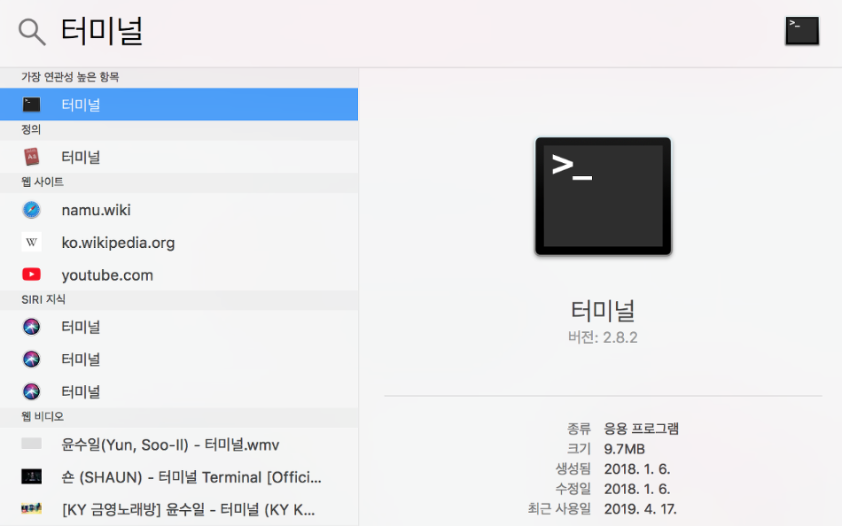 (터미널이 어디 있는지 모를 때는 spotlight(화면 상단 시계 오른쪽 돋보기 아이콘)에 터미널을 검색하면 나옵니다.)