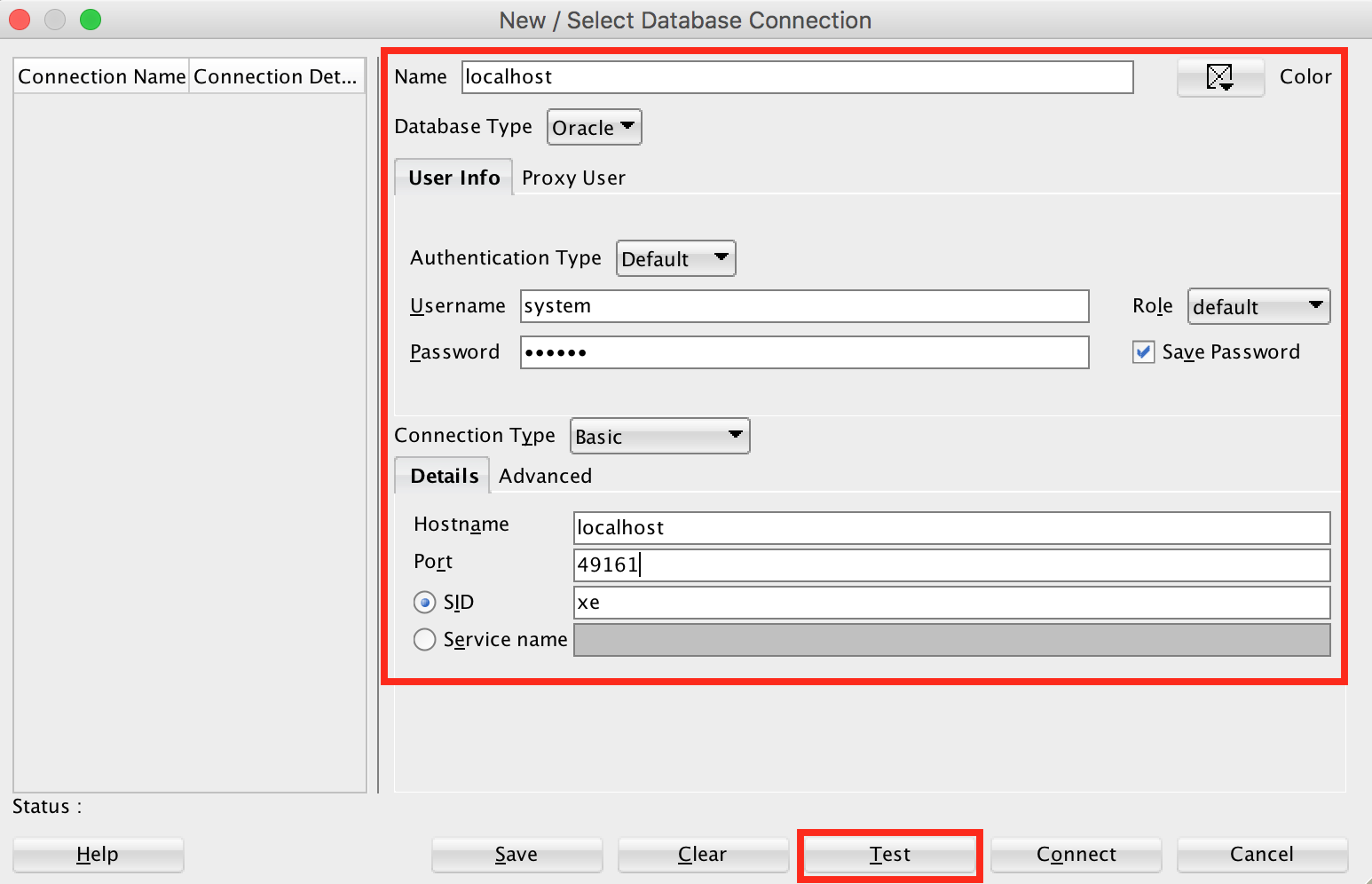 Name : localhost Username : system Password : oracle Port : 49161 |