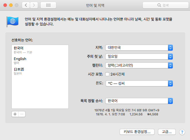 이런 경우에는 [시스템 환경설정] -> [언어 및 지역] 에서
