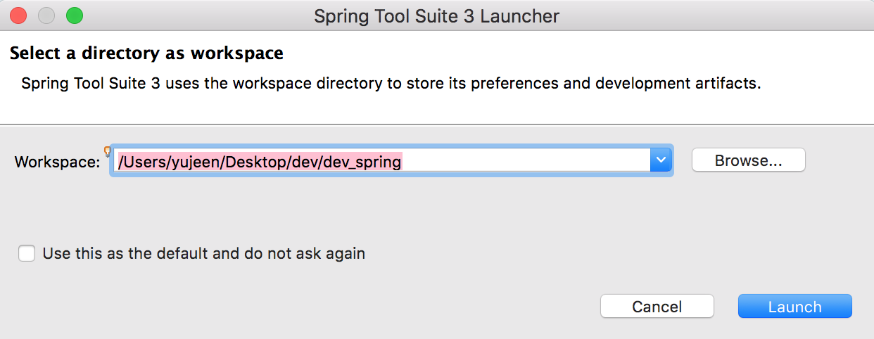5. STS에서 실행하는 파일들을 저장할 저장공간(Workspace)을 설정한 후 Launch를 클릭합니다.